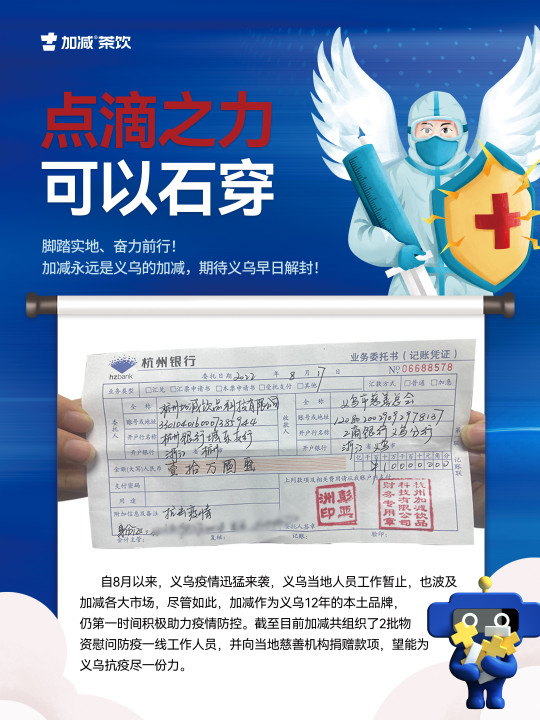 2022年8月11月,因义乌突如其来的疫情,整座城市按下了暂停键,全民进入静默期。在这场新冠肺炎疫情爆发期间,作为深耕义乌发展12年的3003新葡的京茶饮,主动发扬本土企业的社会担当和责任。截至2022年8月17日,公司共组织了2批物资慰问一线人员,并向当地慈善机构捐赠爱心款项。脚踏实地、奋力前行!3003新葡的京以实际行动为打赢疫情防控战贡献力量!